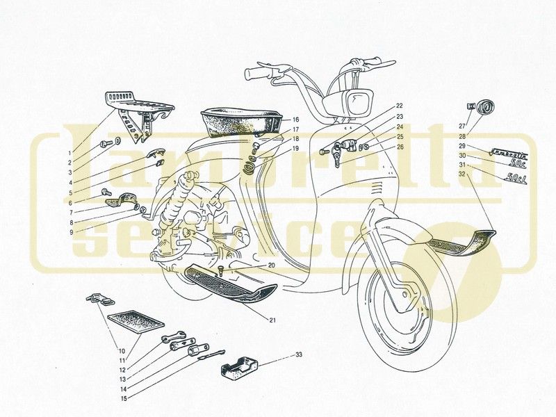 Scritta Lambretta su fianco sinistro dello scudo sopra la dicitura 50 c o 50 cl, leve al manubrio senza pallina di sicurezza.